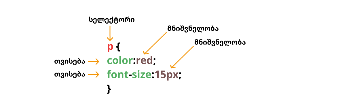 css სინტაქსი შედგება , სელექტორისგან, თვისებისა და თვისების მნიშვნელობისგან
