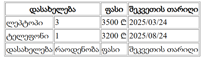 თავი გამოისახება როგორც <thead> ტეგში მოთავსებული <th> ტეგები